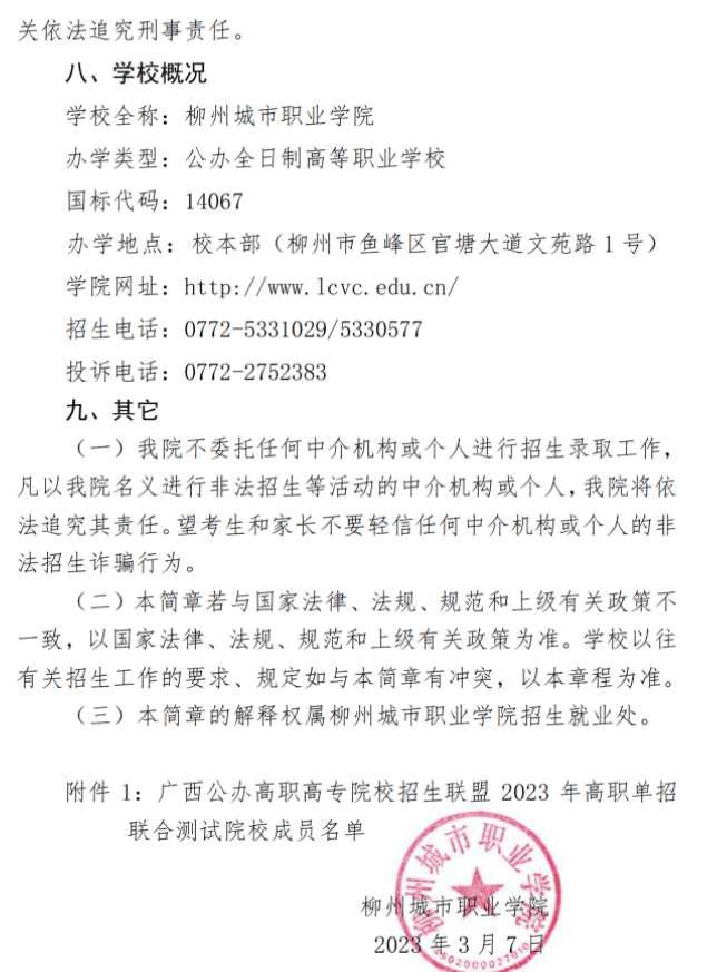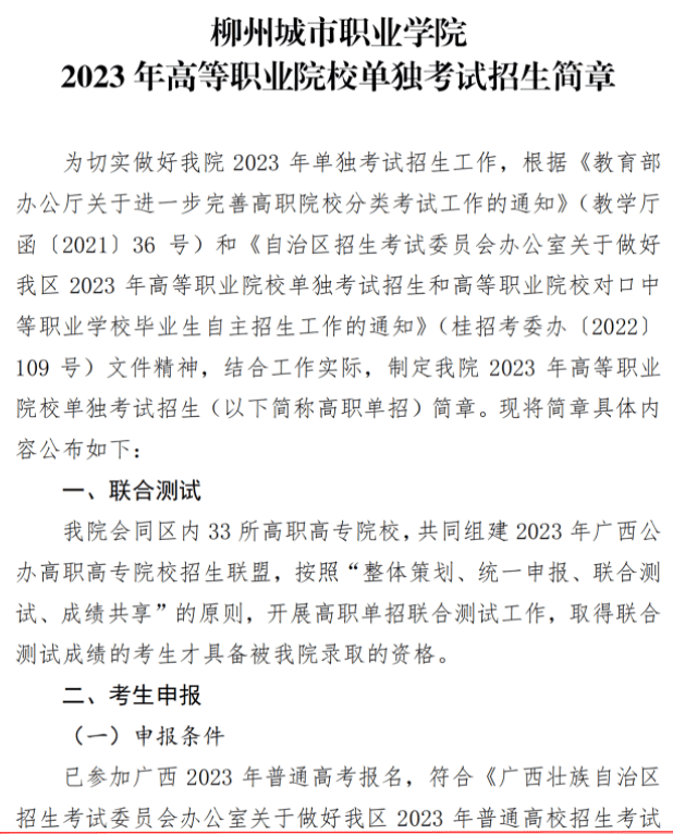 柳州城市职业学院2023年高等职业院校单独考试招生简章